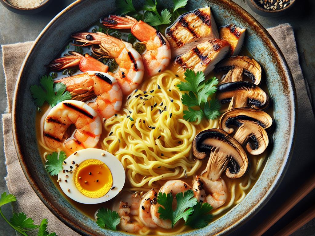 Ce ramen gourmand est une véritable explosion de saveurs et de textures, parfait pour un dîner équilibré et réconfortant. Le mélange de poulet et de crevettes grillées apporte une source de protéines maigres, tandis que les champignons et la coriandre ajoutent des éléments nutritifs et des antioxydants. Le bouillon, riche en saveurs, complète ce plat en apportant une touche de chaleur et de réconfort. Ce plat est non seulement délicieux, mais il est aussi bénéfique pour la santé, offrant un bon équilibre entre protéines, glucides et fibres.