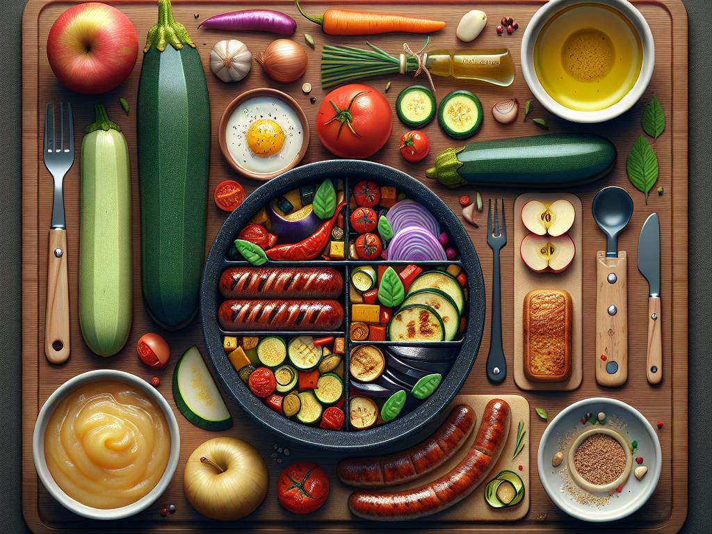 Ce plat allie la richesse des légumes méditerranéens de la ratatouille à la saveur réconfortante d’une saucisse grillée, le tout adouci par une compote de fruits. C’est un repas équilibré qui offre une belle variété de nutriments : des fibres et vitamines des légumes, des protéines de la saucisse, et des glucides naturels de la compote. Parfait pour un dîner savoureux et nutritif !