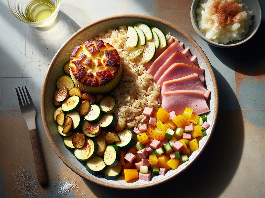 Ce plat équilibré combine des glucides complexes, des protéines maigres et des fibres, tout en offrant une touche sucrée avec un dessert sain. Le riz aux légumes et jambon est une excellente source d’énergie et de nutriments essentiels, tandis que le gâteau aux pommes apporte une douceur naturelle grâce au sucre de coco et au skyr, riche en protéines et faible en matières grasses.
