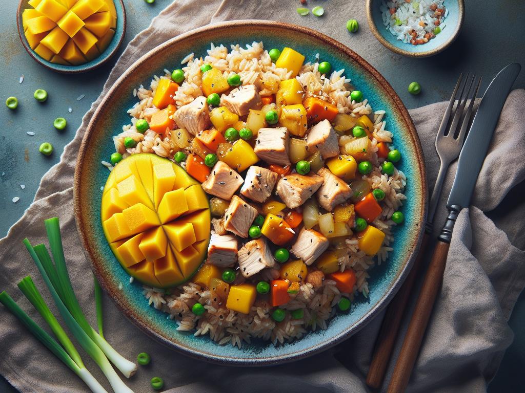 Ce plat de riz sauté avec des légumes et du poulet est non seulement savoureux, mais aussi équilibré et nutritif. Le riz fournit une bonne source de glucides pour l’énergie, tandis que le poulet offre des protéines maigres essentielles pour la construction musculaire. Les légumes comme les carottes et les petits pois ajoutent des fibres et des vitamines, et la mangue apporte une touche de douceur et de vitamine C. Ce repas est parfait pour un déjeuner complet et sain.