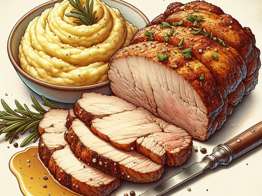 6. Servez le rôti de porc tranché avec la purée maison.