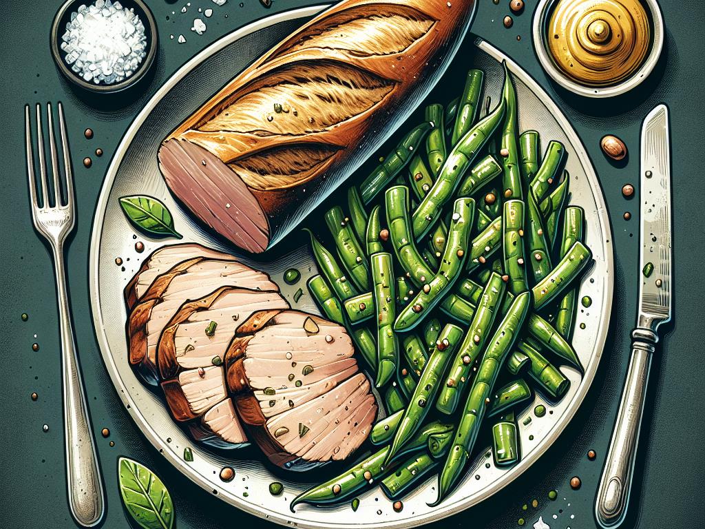 - Disposez le rôti de porc et les haricots verts sur une assiette, accompagnés de la demi-baguette.