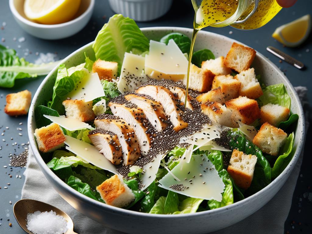 Cette salade César revisitée est non seulement délicieuse mais aussi riche en nutriments essentiels. Les graines de chia et de sésame ajoutent une touche croquante et sont d’excellentes sources de fibres, d’oméga-3 et de minéraux. Ce plat est parfait pour un déjeuner équilibré, offrant une combinaison idéale de protéines, de fibres et de graisses saines.