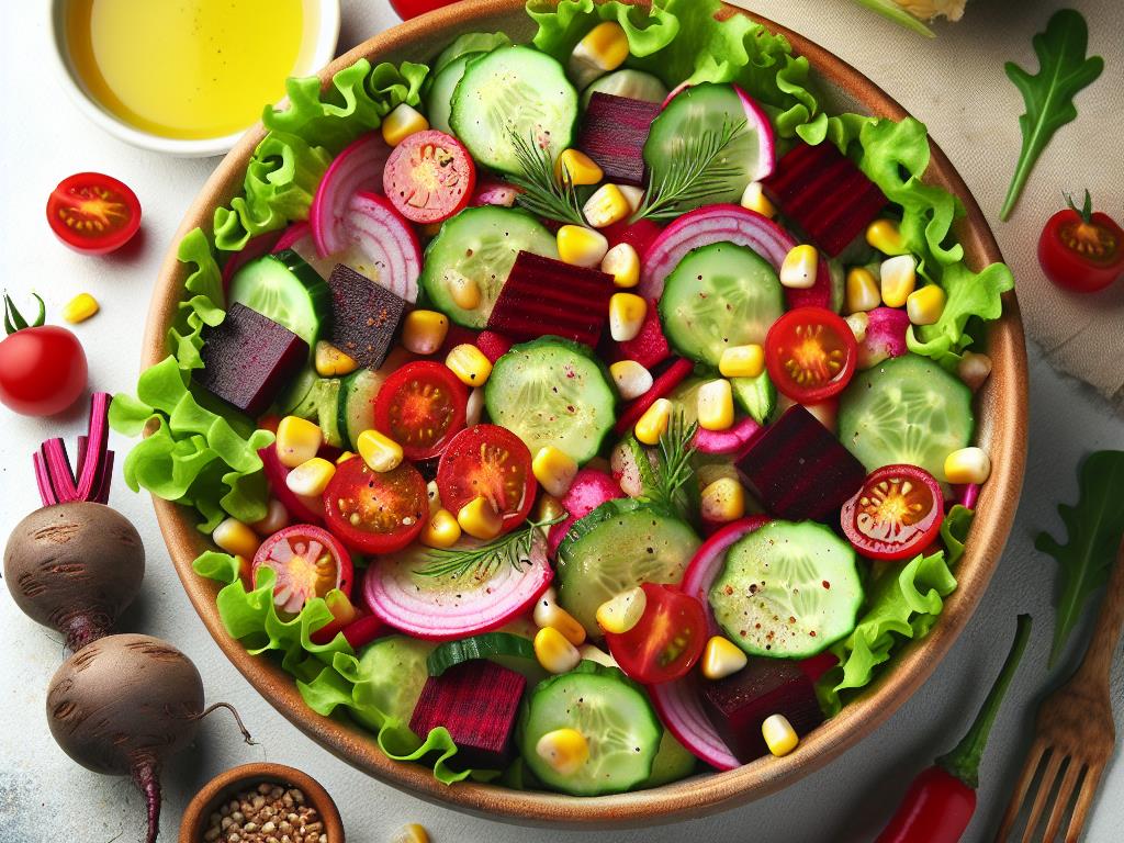 Cette salade croquante et colorée est une véritable explosion de saveurs et de bienfaits pour la santé. Elle est riche en fibres, vitamines, et antioxydants grâce à la variété de légumes et de fruits qu’elle contient. Le concombre et la laitue feuilles de chêne apportent une fraîcheur incomparable, tandis que la betterave et le maïs ajoutent une douceur naturelle. Les tomates cerises et la pomme complètent ce plat avec une touche sucrée et acidulée. C’est un choix parfait pour un dîner léger et nutritif.