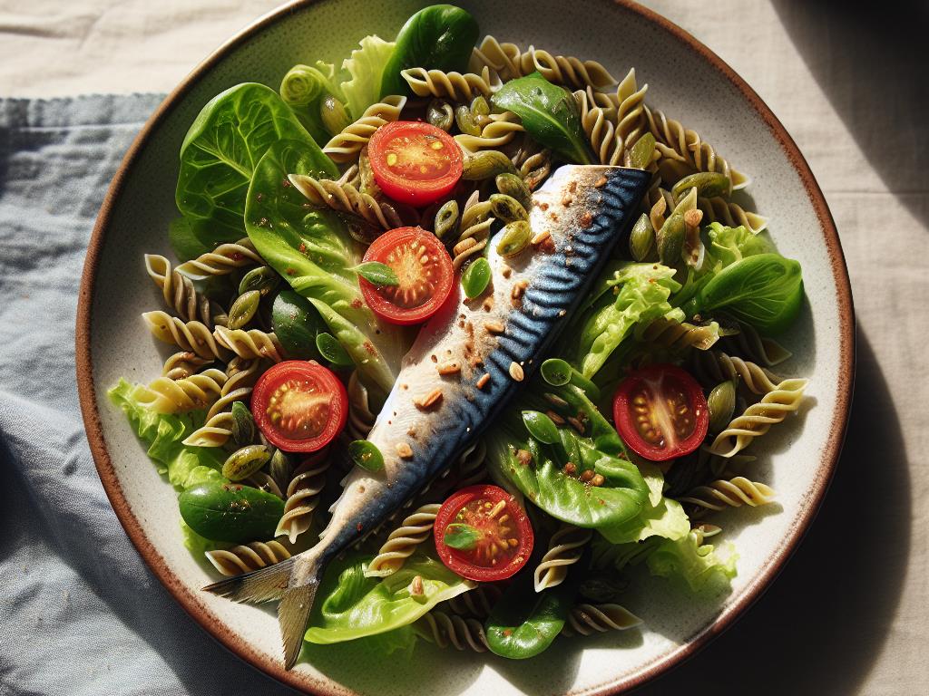 Ce plat apporte environ 500 calories. Il est riche en protéines grâce au maquereau, fournit des glucides complexes avec les pâtes complètes, et est une bonne source de fibres et de vitamines grâce à la salade batavia. Les acides gras oméga-3 du maquereau et les antioxydants de l’huile d’olive contribuent à une bonne santé cardiovasculaire.