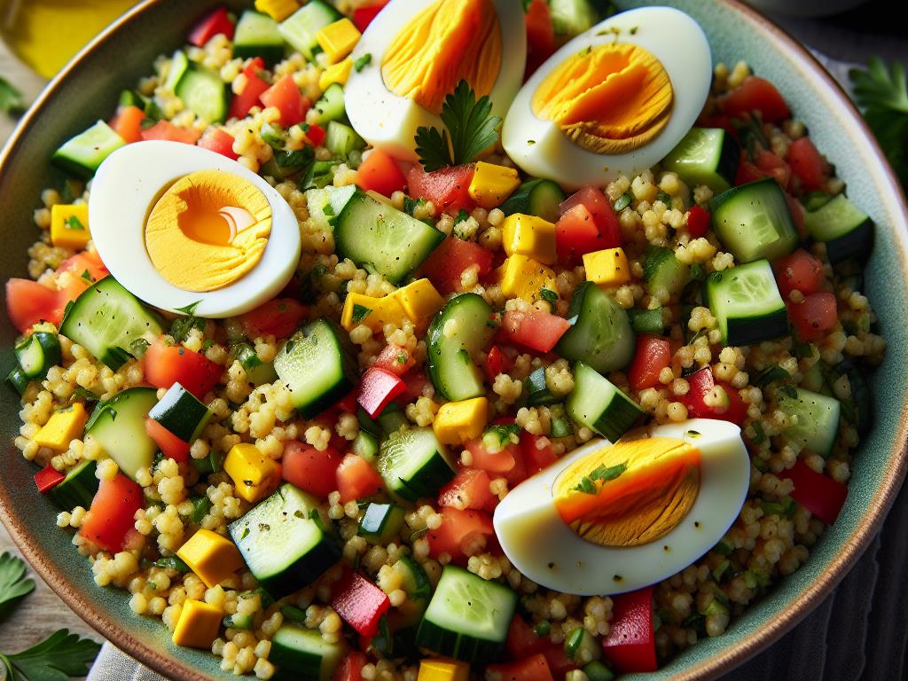 Cette salade de boulghour aux œufs durs est un plat équilibré et nourrissant, parfait pour un déjeuner sain. Le boulghour est une excellente source de glucides complexes, qui fournissent de l’énergie durable, tandis que les œufs apportent des protéines de haute qualité. Les légumes ajoutent des fibres, des vitamines et des minéraux essentiels, faisant de ce plat un choix complet pour maintenir une bonne santé.