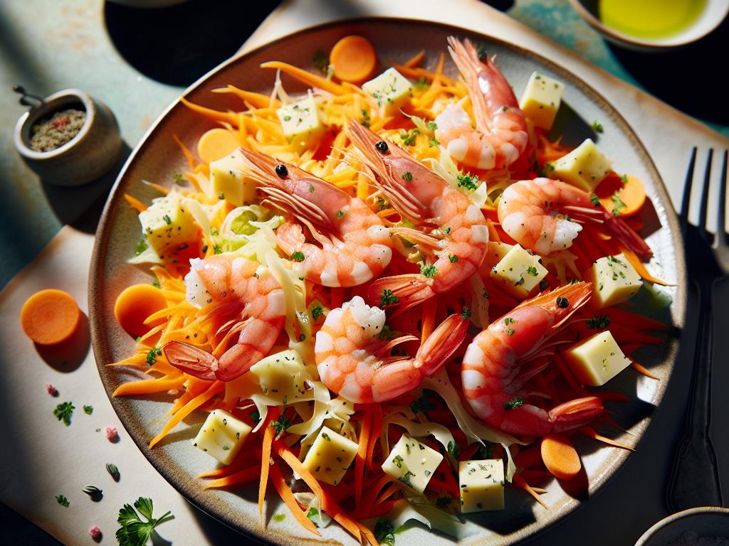 Ce plat est une combinaison savoureuse et équilibrée qui marie la douceur des crevettes roses avec le goût riche du cousteron et la fraîcheur des carottes râpées. Riche en protéines, en fibres et en calcium, cette salade est idéale pour un dîner léger mais nourrissant. Les crevettes apportent des acides gras oméga-3 bénéfiques pour le cœur, tandis que les carottes sont une excellente source de vitamine A, essentielle pour la santé des yeux. Le cousteron, un fromage savoureux, ajoute une touche de calcium et de protéines supplémentaires, complétant parfaitement ce repas équilibré.