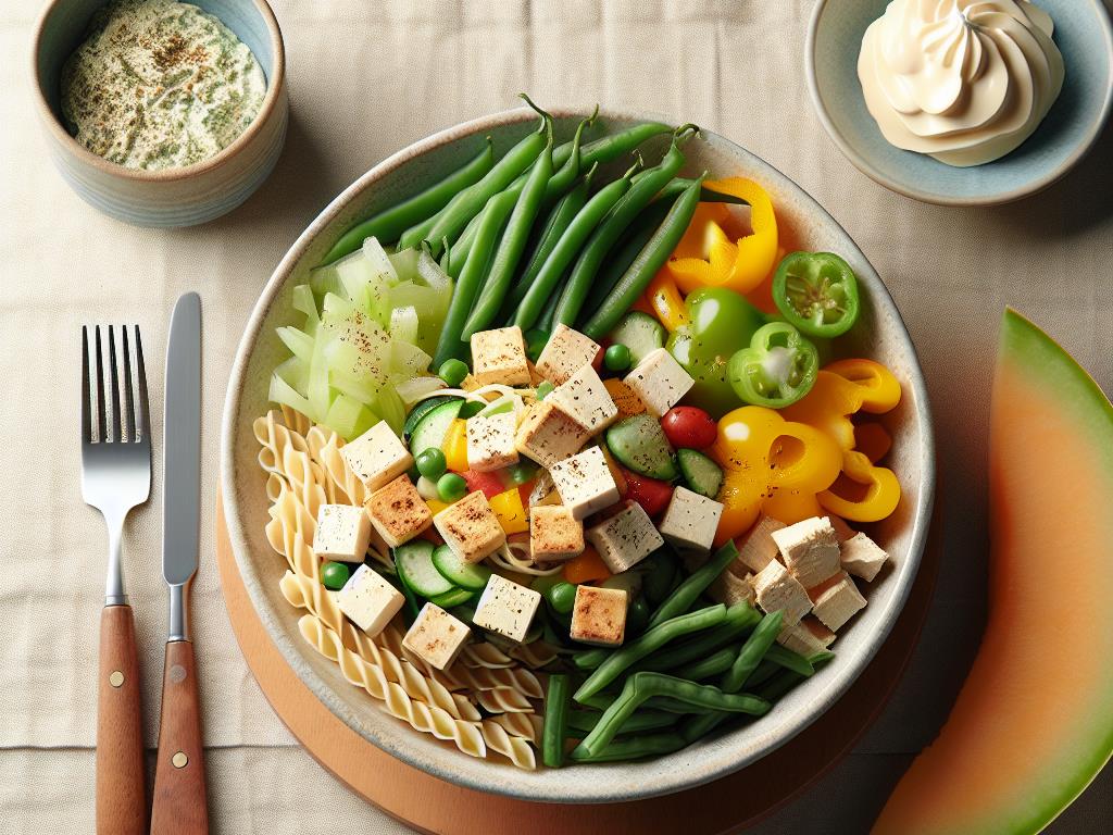 Cette salade de pâtes au tofu et légumes croquants est un plat équilibré et savoureux qui combine des glucides complexes, des protéines végétales et des fibres. Les pâtes de blé complet apportent une énergie durable, tandis que le tofu aux herbes offre une source de protéines végétales de qualité. Les poivrons et haricots verts ajoutent une touche de fraîcheur et de vitamines, et le melon en dessert complète le repas avec une note sucrée et hydratante. C’est un plat idéal pour un déjeuner léger et nutritif.