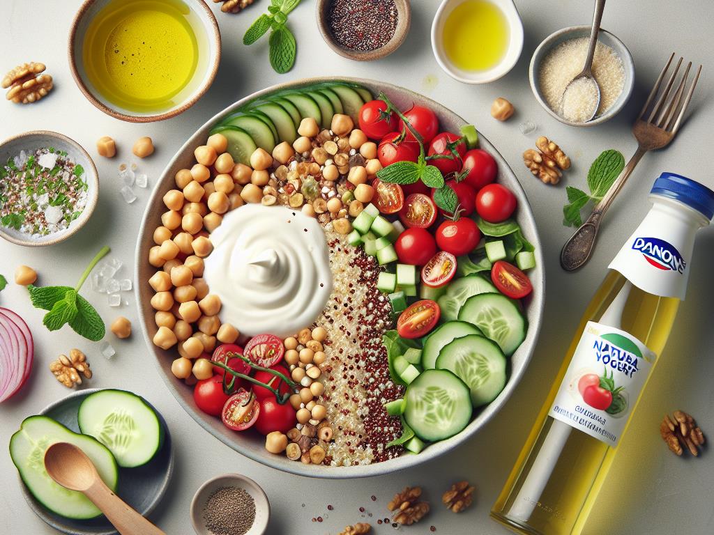 Cette salade de quinoa au yaourt nature est un plat équilibré qui combine des protéines, des glucides complexes et des graisses saines. Le yaourt nature Danone apporte une touche crémeuse et une bonne dose de probiotiques bénéfiques pour la digestion. Le quinoa, riche en protéines végétales, s’associe parfaitement aux légumes frais pour offrir un repas nourrissant et savoureux.