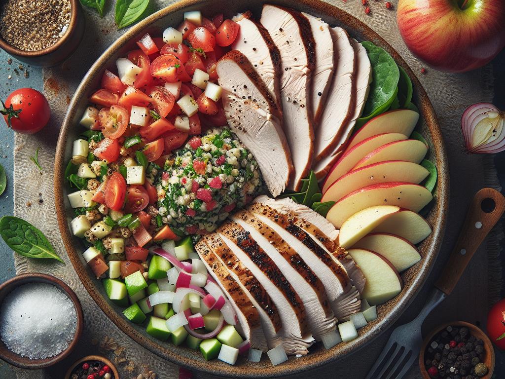 Cette salade de taboulé et rôti de dinde aux pommes est un repas équilibré, idéal pour un déjeuner sain et nourrissant. Elle combine des protéines maigres, des fibres et des vitamines, tout en offrant une explosion de saveurs grâce à l’association de la tomate, de l’oignon et du vinaigre balsamique. Les pommes ajoutent une touche de douceur et de fraîcheur, rendant ce plat à la fois satisfaisant et revitalisant.