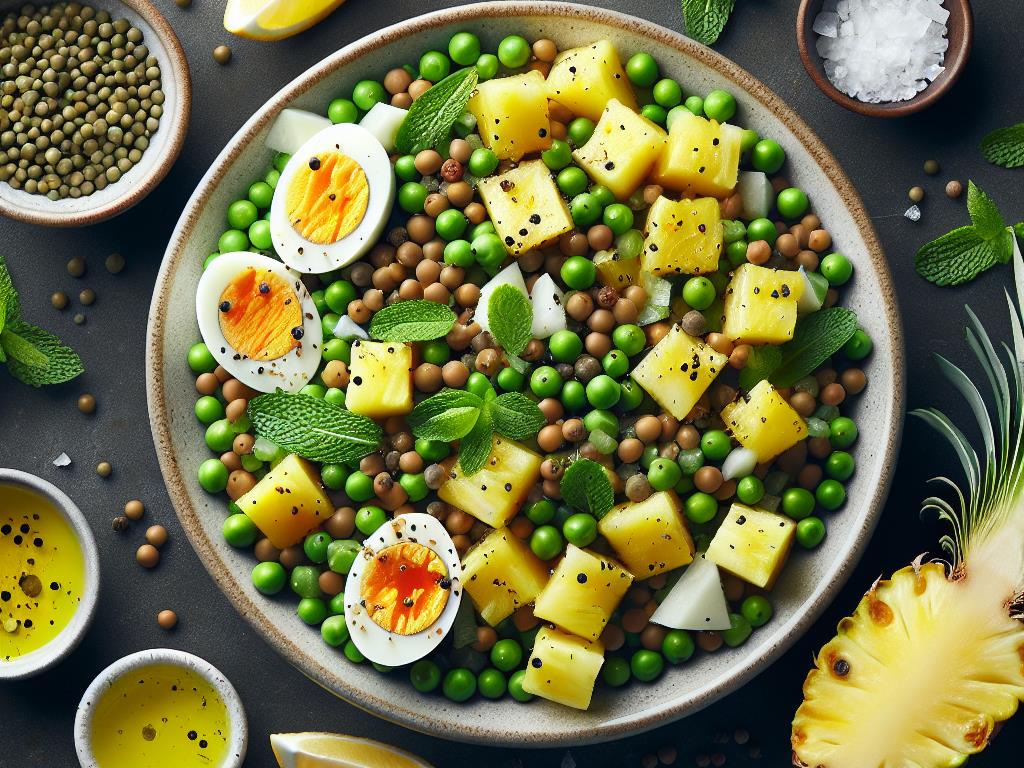 Cette salade énergisante est un mélange savoureux et équilibré qui combine la richesse en protéines des œufs et des lentilles avec la douceur rafraîchissante de l’ananas. Les petits pois ajoutent une touche de verdure et de fibres, rendant ce plat non seulement délicieux mais aussi nutritif. Idéal pour un déjeuner léger mais satisfaisant, ce plat est parfait pour maintenir votre énergie tout au long de la journée.
