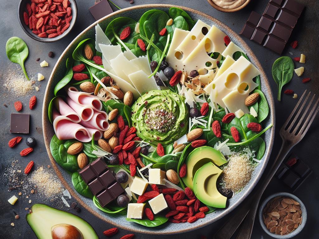 Cette salade énergisante est un véritable concentré de bienfaits nutritionnels. Elle combine des ingrédients riches en nutriments essentiels, tels que les épinards, l’avocat, et le houmous, pour offrir un repas équilibré et savoureux. Les baies de goji et le chocolat noir ajoutent une touche d’antioxydants, tandis que le parmesan et le jambon blanc apportent des protéines de qualité. C’est un plat idéal pour recharger vos batteries tout en prenant soin de votre santé.