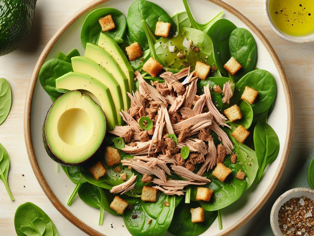 Cette salade est un choix parfait pour un déjeuner équilibré et nutritif. Elle combine la richesse en fibres et vitamines des épinards, les protéines de la viande effilochée, les graisses saines de l’avocat, et le croquant des croûtons. Ce plat est non seulement délicieux mais aussi bénéfique pour maintenir une bonne énergie tout au long de la journée.