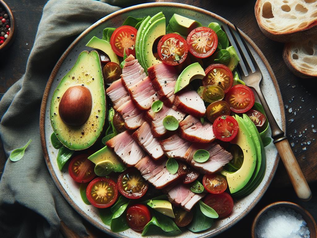 Cette salade gourmande est un excellent choix pour un dîner équilibré. Elle combine des protéines maigres, des graisses saines et des glucides complexes, offrant un repas complet et satisfaisant. Le rôti de porc apporte des protéines essentielles pour la réparation musculaire, tandis que l’avocat fournit des graisses monoinsaturées bénéfiques pour le cœur. La tomate ajoute une touche de fraîcheur et de vitamine C, et le pain au levain complète le tout avec des glucides pour l’énergie.