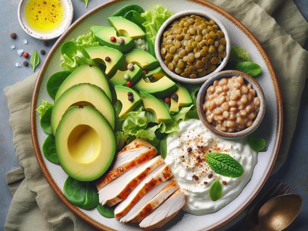Cette salade gourmande est un véritable concentré de bienfaits nutritionnels. Elle combine la richesse en fibres et protéines des lentilles, la douceur crémeuse de l’avocat, et la légèreté du filet de poulet. Le fromage blanc sucré à la stevia apporte une touche finale douce et légère. Ce plat est parfait pour un déjeuner équilibré, offrant une bonne dose d’énergie tout en étant savoureux et rassasiant.