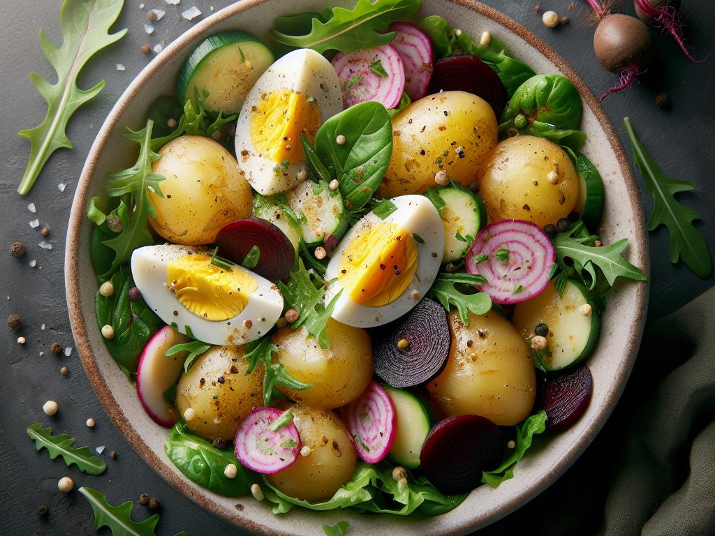 Cette salade composée est un véritable concentré de saveurs et de nutriments. Elle combine des glucides complexes, des protéines, des fibres, et des vitamines, offrant ainsi un repas équilibré et satisfaisant. Les pommes de terre apportent de l’énergie durable, tandis que les œufs fournissent des protéines de haute qualité. La salade verte et les pousses de betterave ajoutent une touche de fraîcheur et de couleur, tout en étant riches en antioxydants.