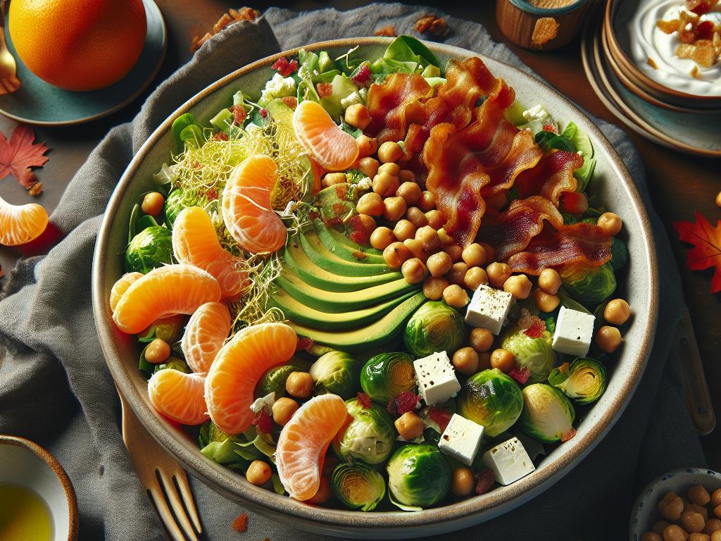 Cette salade gourmande d’automne est un plat équilibré qui combine des ingrédients riches en nutriments et en saveurs. Le mélange de l’onctuosité de l’avocat, du croquant des choux de Bruxelles, et de la douceur des mandarines crée une harmonie parfaite. Les pois chiches apportent des protéines végétales, tandis que la fêta et le lard fumé ajoutent une touche savoureuse et réconfortante. Le gâteau au yaourt pomme poire en dessert complète ce repas avec une note sucrée et fruitée. Ce plat est idéal pour un dîner équilibré, riche en fibres, vitamines, et protéines.