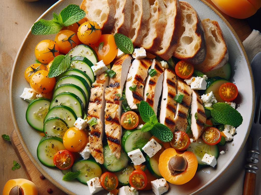 Cette salade méditerranéenne est un véritable délice pour les papilles et une mine de bienfaits pour votre santé. Riche en protéines grâce au poulet, elle est également une excellente source de fibres et de vitamines grâce aux légumes et aux fruits. L’association de la semoule et du pain au levain offre une bonne dose de glucides complexes pour vous maintenir énergisé tout au long de la journée. L’huile d’olive et la féta ajoutent une touche de saveur et de bons lipides, tandis que la menthe et l’abricot apportent une fraîcheur et une douceur irrésistibles.