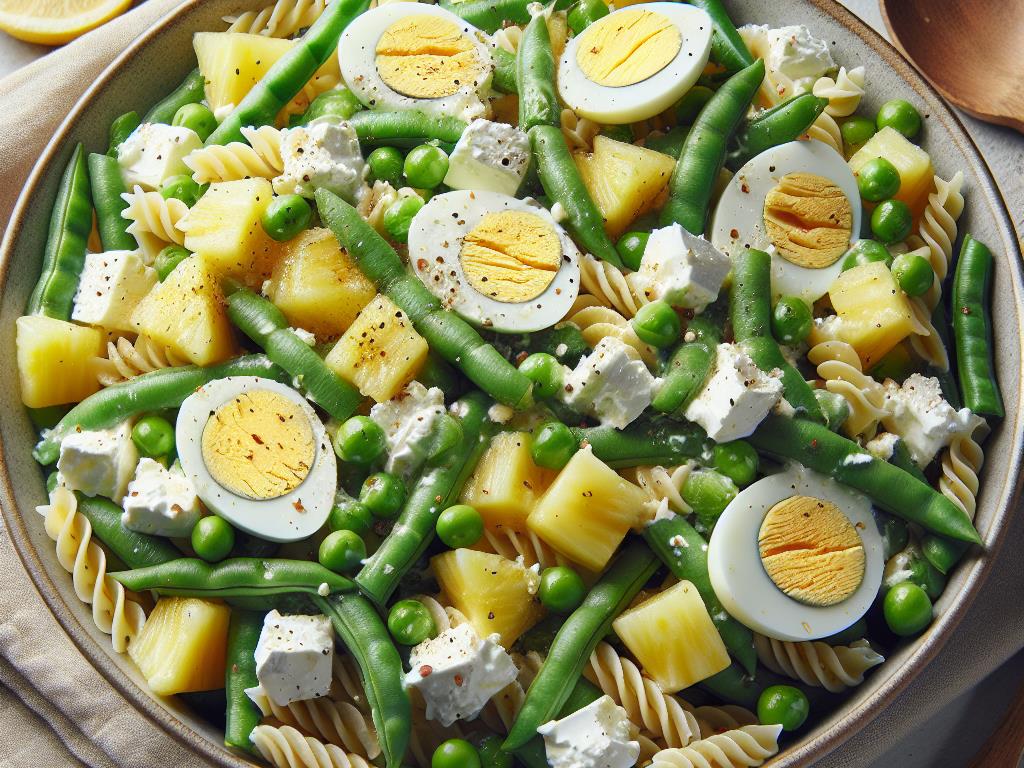 - Dans un grand bol, mélangez les pâtes refroidies, les haricots verts, les blancs d’œufs, et l’ananas.