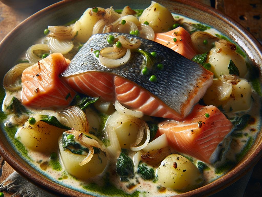 Ce plat de Saumon et Colin d’Alaska à l’oseille est une option savoureuse et nutritive pour un déjeuner équilibré. Riche en protéines grâce au saumon et au colin, il est également une excellente source d’oméga-3, bénéfiques pour la santé cardiovasculaire. Les pommes de terre apportent des glucides complexes pour l’énergie, tandis que l’oseille et les oignons ajoutent des vitamines et des antioxydants. La crème fraîche et le beurre offrent une touche de douceur et de richesse, rendant ce plat à la fois délicieux et réconfortant.