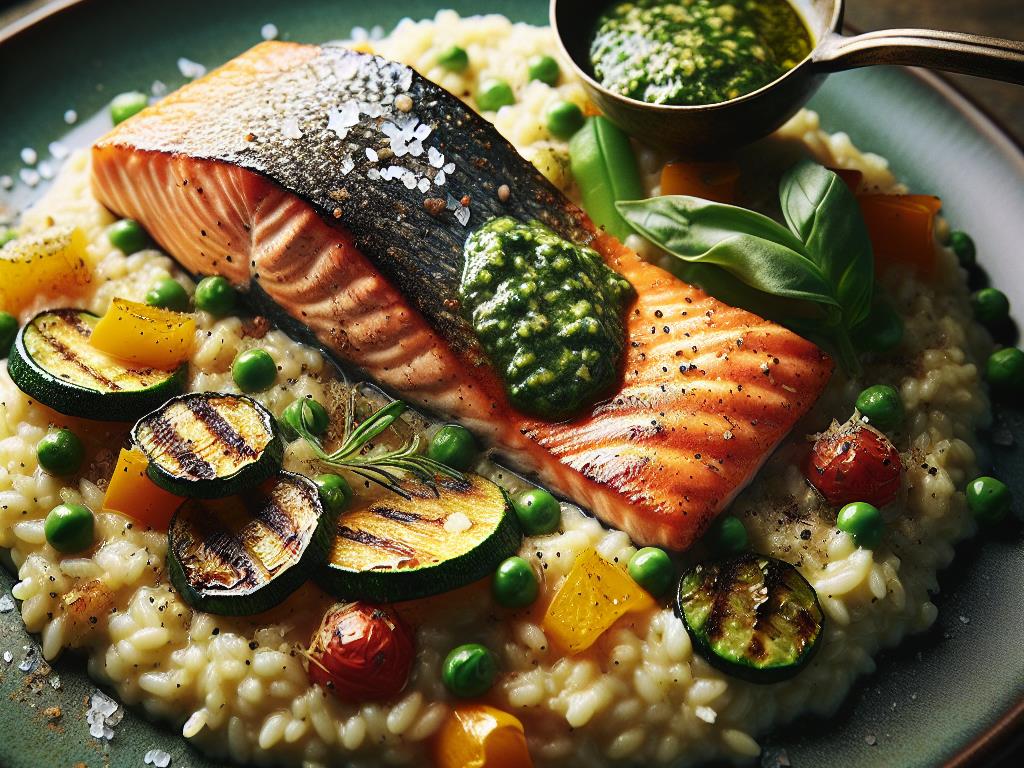 Ce plat de saumon grillé accompagné d’un risotto crémeux aux légumes et d’une sauce pesto est un véritable délice pour les papilles et une option nutritive pour un dîner équilibré. Le saumon est une excellente source d’oméga-3 et de protéines, tandis que le risotto apporte des glucides complexes pour l’énergie. Les légumes ajoutent des fibres et des vitamines, et le pesto, riche en herbes, ajoute une touche de saveur et d’antioxydants.