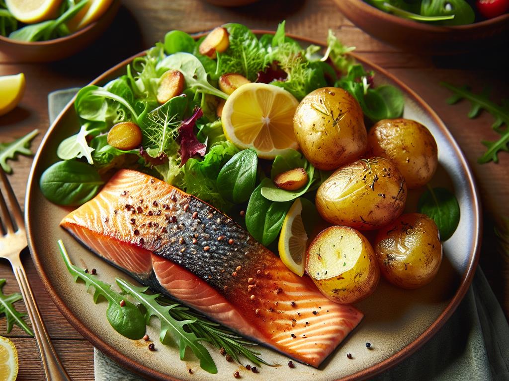 Ce plat de saumon rôti accompagné de pommes de terre et de salade verte est une option délicieuse et nutritive pour un déjeuner équilibré. Le saumon est une excellente source de protéines et d’oméga-3, bénéfiques pour le cœur et le cerveau. Les pommes de terre fournissent des glucides complexes pour l’énergie, tandis que la salade verte apporte des fibres et des vitamines essentielles. Ensemble, ces ingrédients créent un repas harmonieux et satisfaisant.