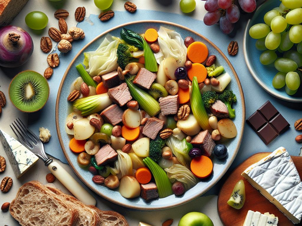 Ce plat est une excellente option pour un déjeuner équilibré et nutritif. Il combine des légumes riches en fibres et en vitamines, des protéines maigres de la viande de porc, et une touche de douceur avec le raisin et le kiwi. Le pain complet et le fromage de chèvre ajoutent des glucides complexes et des graisses saines, tandis qu’un carré de chocolat offre une délicieuse fin de repas. Ce mélange harmonieux de saveurs et de textures contribue à une alimentation variée et équilibrée.