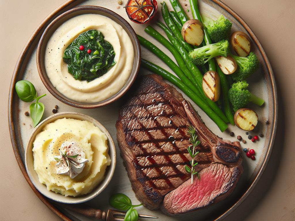 - Servez le steak avec la purée de pommes de terre et les légumes verts en accompagnement.