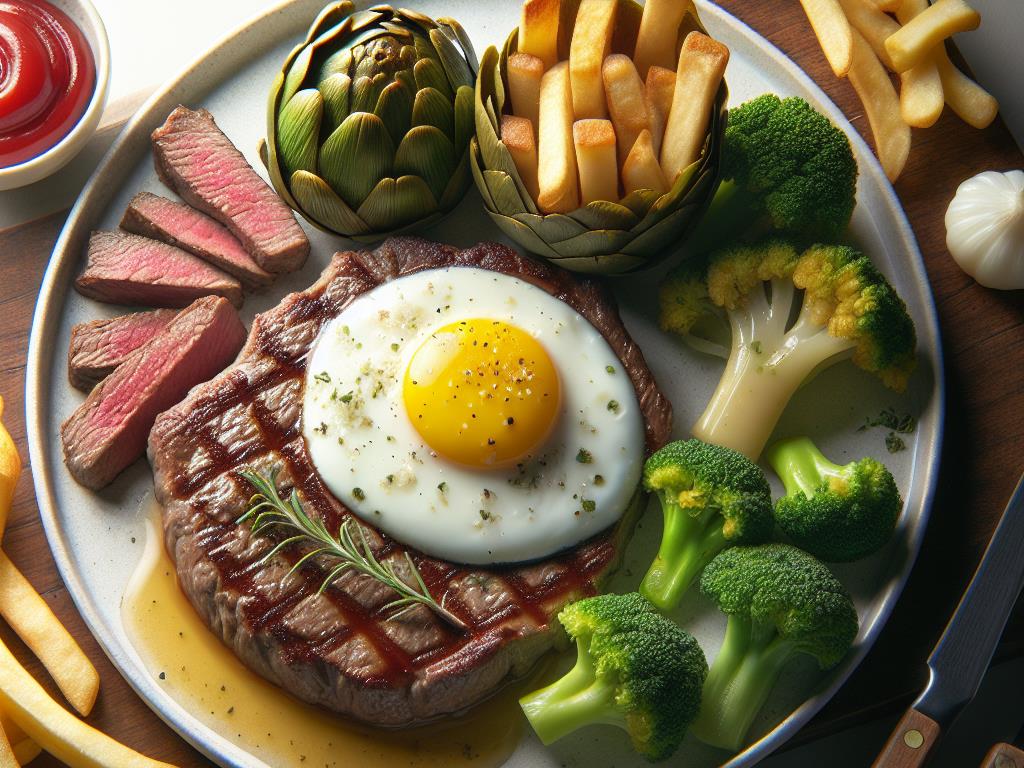 Steak Haché Gourmet avec Œuf au Plat, Frites Légères, Brocolis et Artichauts