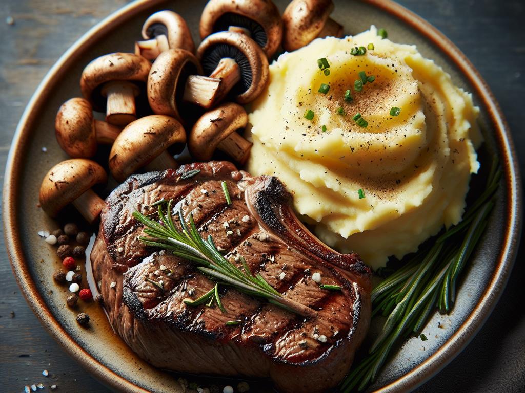 - Servez le steak accompagné de la purée de pommes de terre et des champignons sautés.