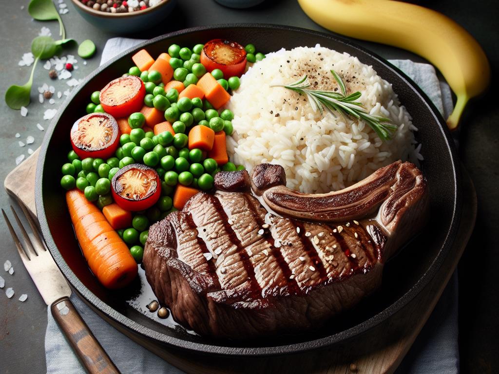 5. Servez le steak avec le riz et les légumes. Dégustez la banane en dessert pour compléter votre repas.