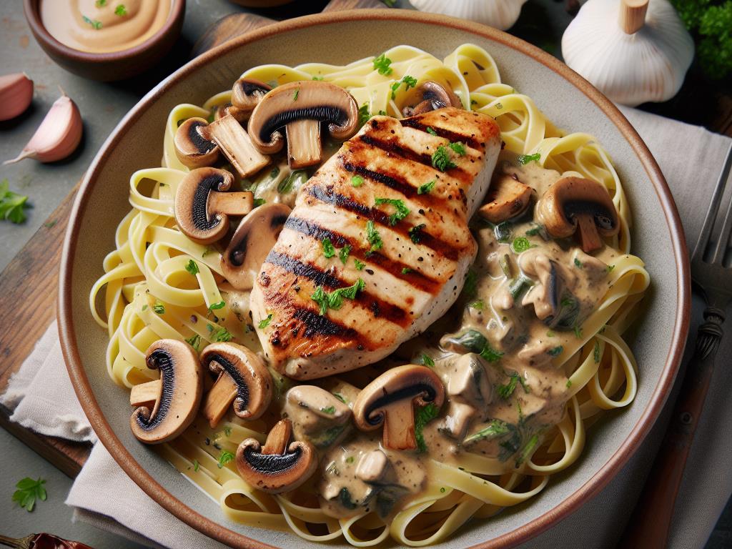 Ce plat de tagliatelles konjac au poulet grillé et sauce crémeuse aux champignons est une option délicieuse et équilibrée pour un déjeuner léger. Le konjac est une excellente alternative aux pâtes traditionnelles, faible en calories et riche en fibres, ce qui en fait un choix idéal pour ceux qui cherchent à contrôler leur apport calorique tout en se faisant plaisir. Le poulet grillé fournit une bonne source de protéines maigres, et la sauce crémeuse aux champignons ajoute une touche de gourmandise sans excès de matières grasses grâce à l’utilisation de crème fraîche allégée.