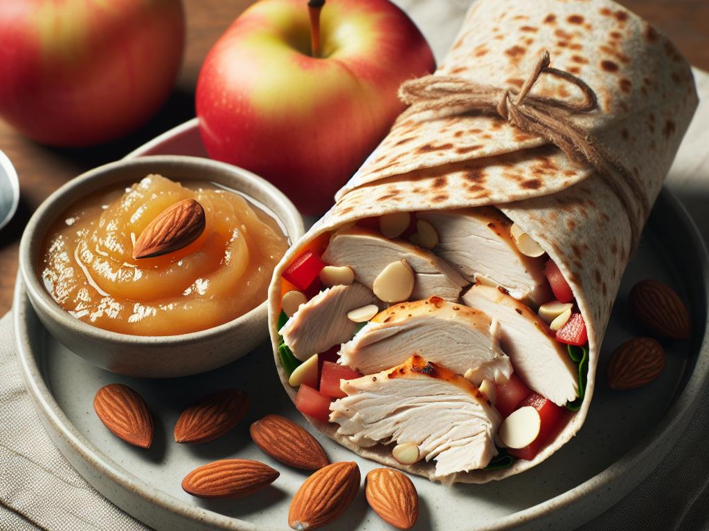Ce wrap est une option délicieuse et équilibrée pour un repas sain. Il combine des protéines maigres, des glucides complexes et des graisses saines, ce qui en fait un choix parfait pour maintenir votre énergie tout au long de la journée. Le blanc de poulet apporte des protéines essentielles pour la construction musculaire, tandis que les amandes fournissent des acides gras insaturés bénéfiques pour le cœur. La tomate ajoute une touche de fraîcheur et de vitamines, et la compote de fruits sans sucre ajouté complète ce repas avec une note sucrée naturelle.