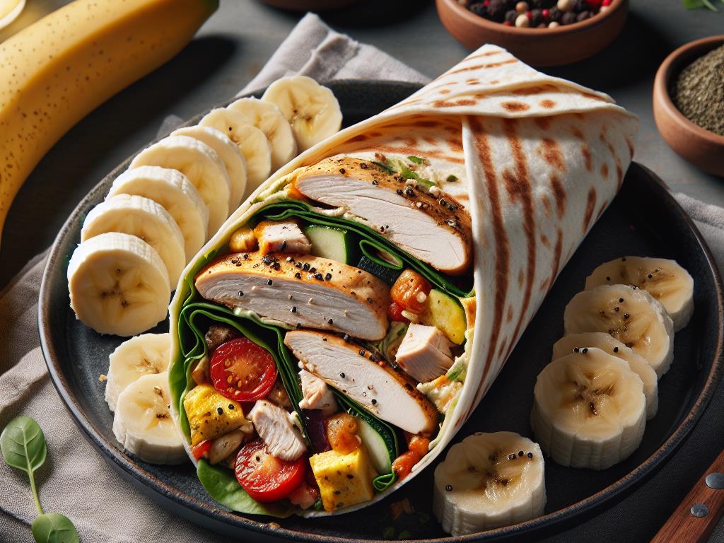Ce wrap poulet et ratatouille est un choix parfait pour un déjeuner équilibré. Riche en protéines grâce au poulet et à l’omelette, il est également une excellente source de fibres et de vitamines grâce à la ratatouille et à la banane. Ce repas vous apportera l’énergie nécessaire pour continuer votre journée tout en étant léger et savoureux.
